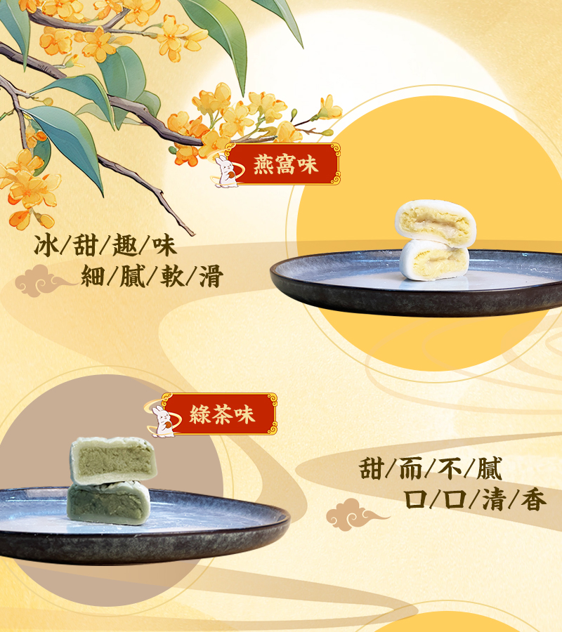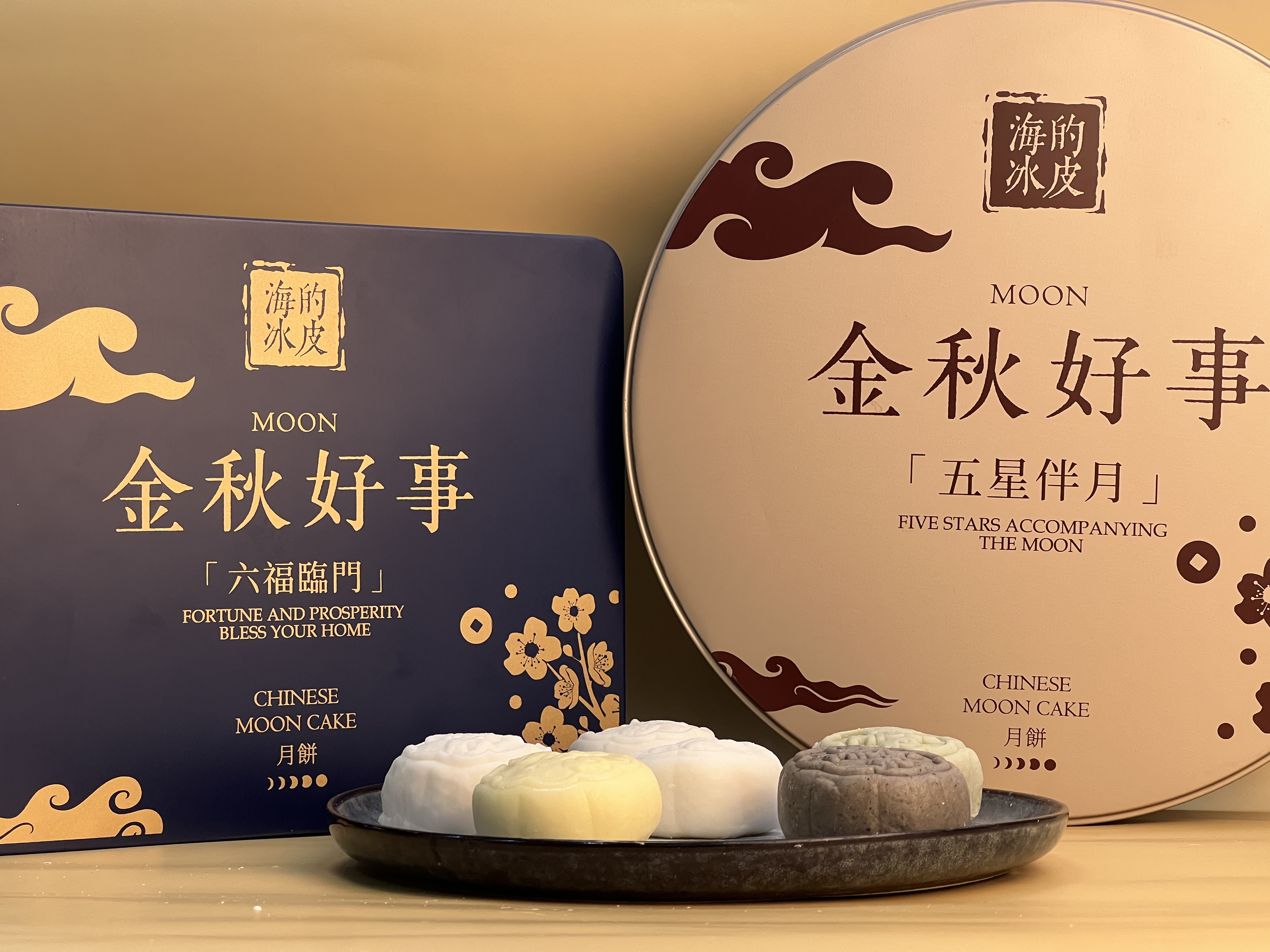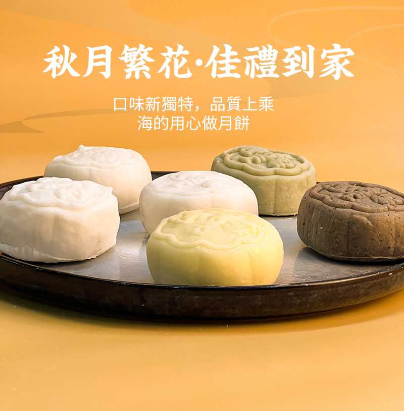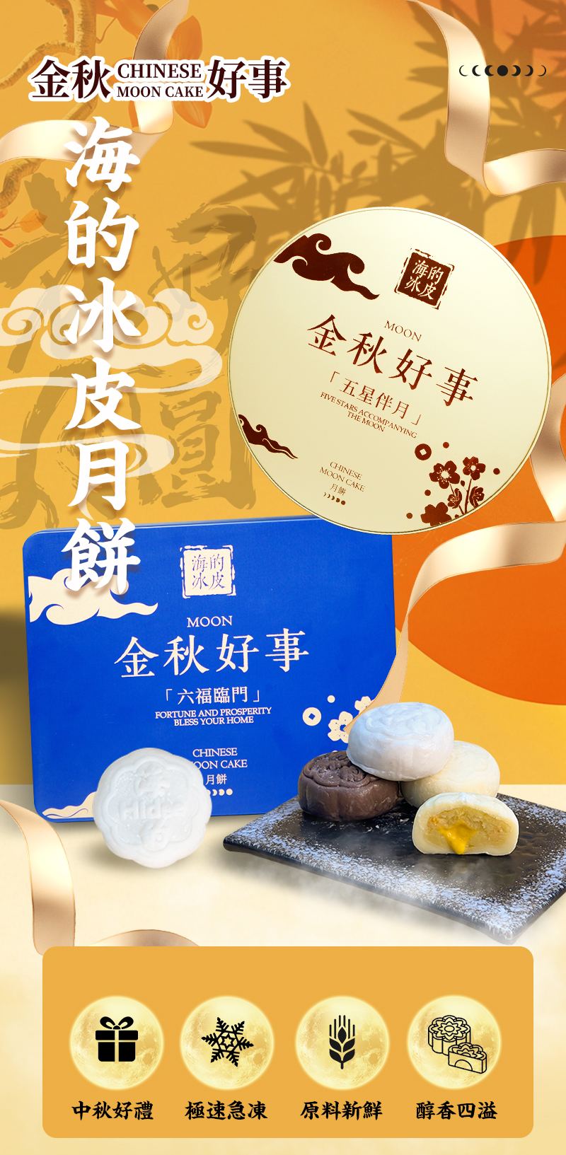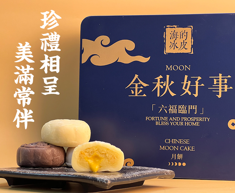 金秋好事-海的冰皮:傳統風味,全新體驗 海的冰皮月餅,以其獨特的口感和精緻的風味,為您帶來與眾不同的中秋佳節體驗。告別傳統月餅的油膩厚重,冰皮月餅以其Q彈軟糯的外皮和清爽綿密的內餡,成為新一代消費者的首選。我們嚴選優質食材,結合傳統工藝與現代技術,打造出這款口感豐富、層次分明的冰皮月餅,讓您在品嚐美味的同時,也能感受到健康與輕盈。 海的冰皮月餅不僅僅是一種美食,更是一份對傳統文化的致敬。我們堅持使用高品質的糯米粉,經過精細研磨,確保冰皮的Q彈口感。內餡則採用天然健康的食材,經過多道工序精心調製,口感細膩,甜度適中,入口即化。無論是自己享用,還是饋贈親友,海的冰皮月餅都是一份充滿心意的選擇。 為了讓您更了解我們的產品,以下列出金秋好事海冰皮月餅的重點功能: Q彈軟糯冰皮: 採用優質糯米粉製作,口感柔軟Q彈,入口即化,帶來全新味蕾享受。 清爽綿密內餡:嚴選天然健康食材,精心調製,口感細膩,甜度適中,告別傳統月餅的油膩。 多種口味選擇:提供多種口味內餡選擇,滿足不同消費者的口味需求。 精美禮盒包裝:設計精美的禮盒包裝,是您中秋饋贈親友的理想選擇。 新鮮製造,保質保鮮:我們堅持新鮮製造,並採用嚴格的保鮮技術,確保您品嚐到的每一口都是最新鮮的味道。 金秋好事-海的冰皮月餅,用一份心意,締造一份團圓。 讓我們一起品嚐這份來自金秋的祝福,共同迎接美好的中秋佳節! 兩款包裝: 乘風破浪經典藍盒:六福臨門包含六種口味 綠豆:傳統口味,清新口感 榴蓮:採用貓山王新鮮榴蓮肉製成,啖啖榴槤肉 香芒:每一啖都係清新芒果 味 黑芝麻:醇香黑芝麻,甘香好味道 綠茶:清新綠茶,茶香四溢 朱古力:流心朱古力,一口爆漿 金秋好事高貴金盒:五星伴月包含六種口味 燕窩:滋補甜品,絲絲心意 綠豆:傳統口味,清新口感 榴蓮:採用貓山王新鮮榴蓮肉製成,啖啖榴槤肉 香芒:每一啖都係清新芒果 味 黑芝麻:醇香黑芝麻,甘香好味道 綠茶:清新綠茶,茶香四溢