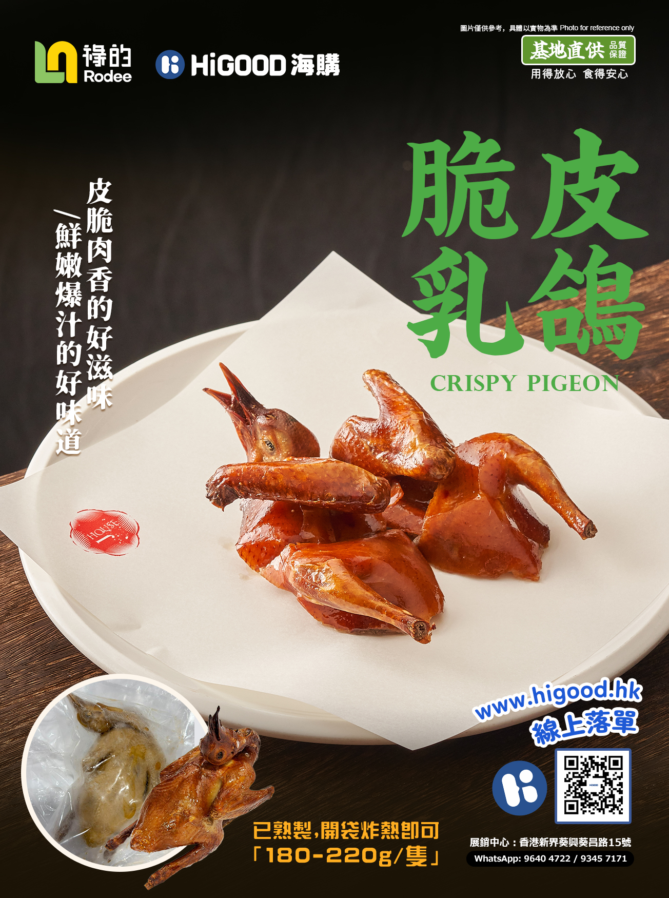 精選優質乳鴿,每隻重量180-220g 已經過深加工處理,製熟冷凍保存。 超級方便的製作方法,用熱油炸熱即可食用。